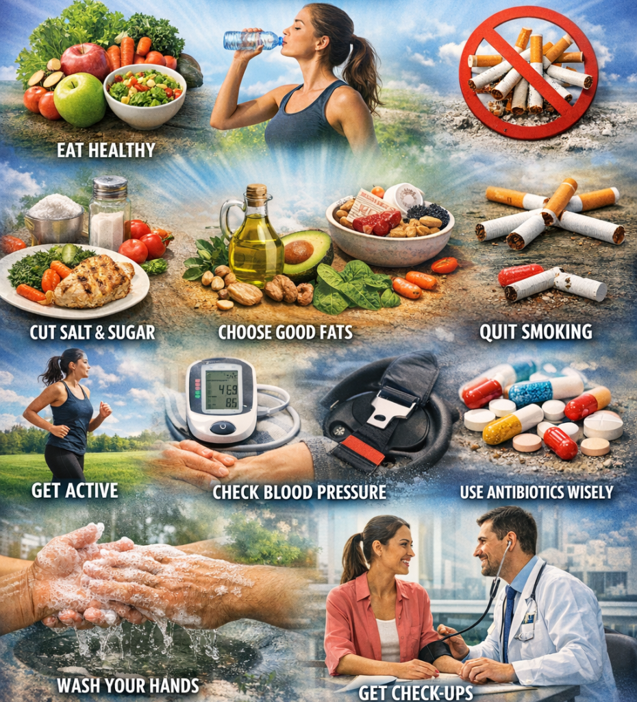Leading a healthy lifestyle is about consistency, not perfection. Combining good nutrition, physical activity, proper hygiene, preventive care, and safe habits can drastically reduce your risk of disease and improve overall well-being. Start small, stay consistent, and make 2026 a year of positive health changes.